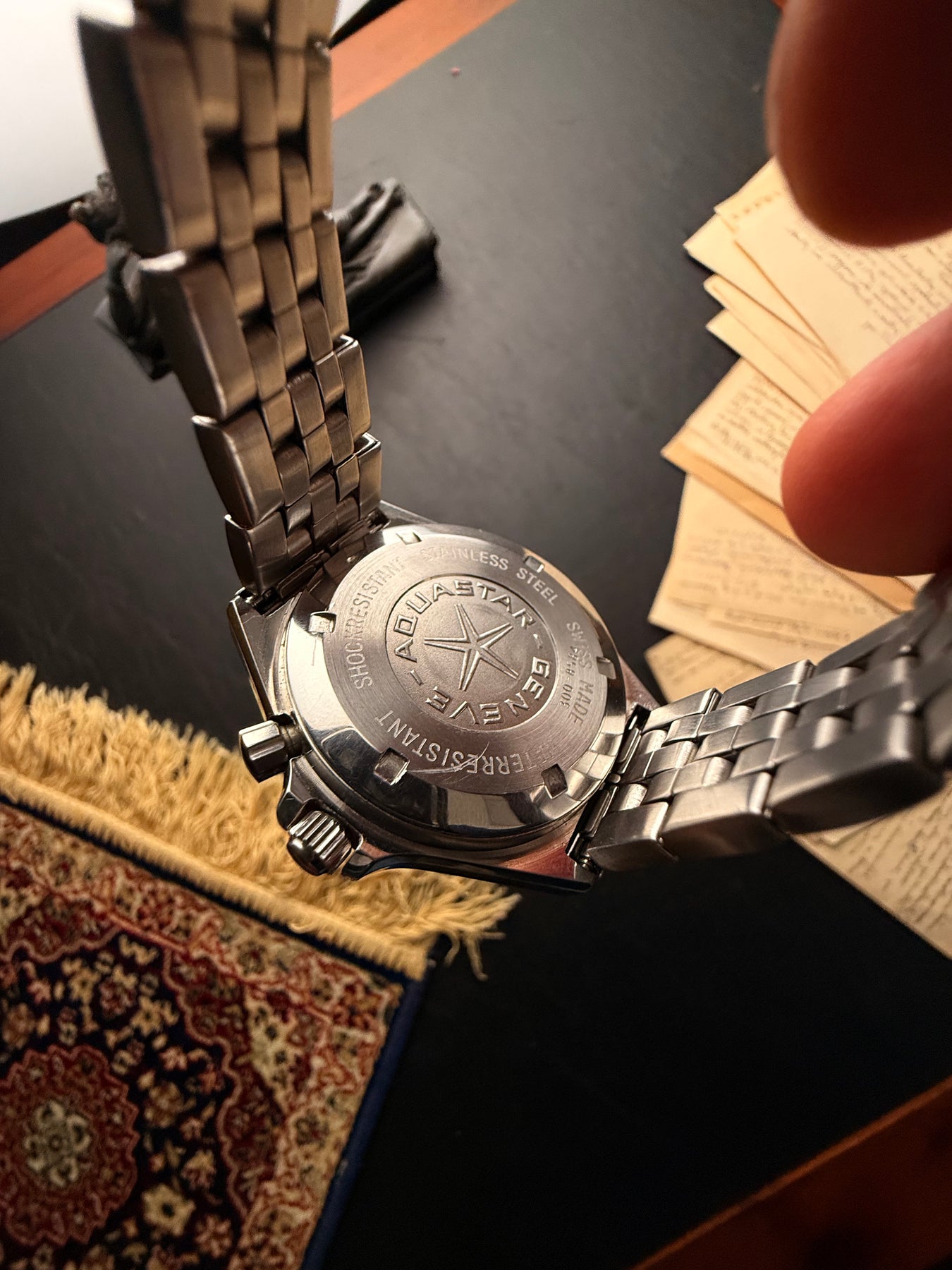 The screw-down case back proudly displays the large Aquastar star and distinct engravings, certifying its Swiss pedigree and water resistance.
