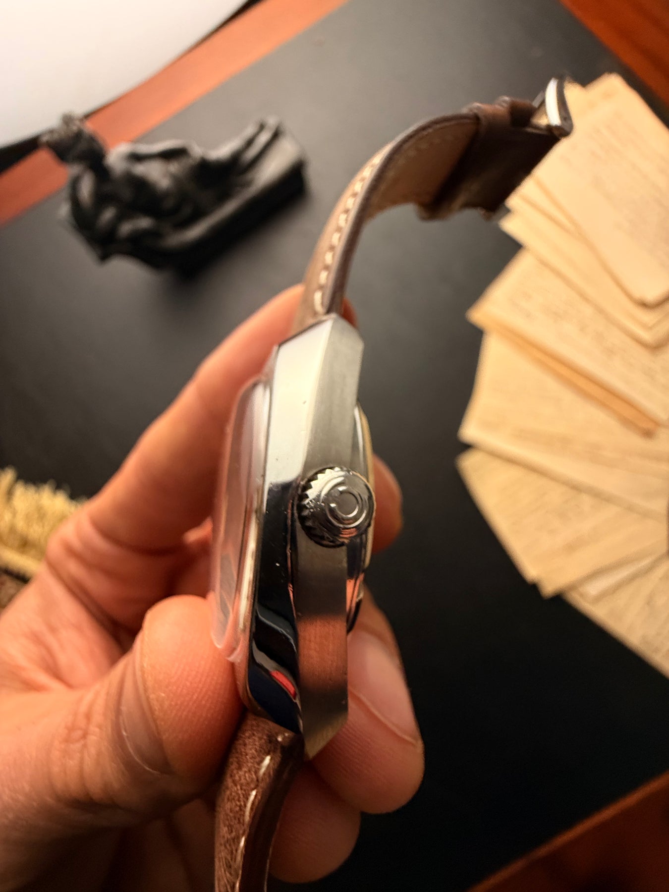The watch is paired with a durable brown leather strap with contrast stitching, completing the vintage look for a collector who values history and resilience.