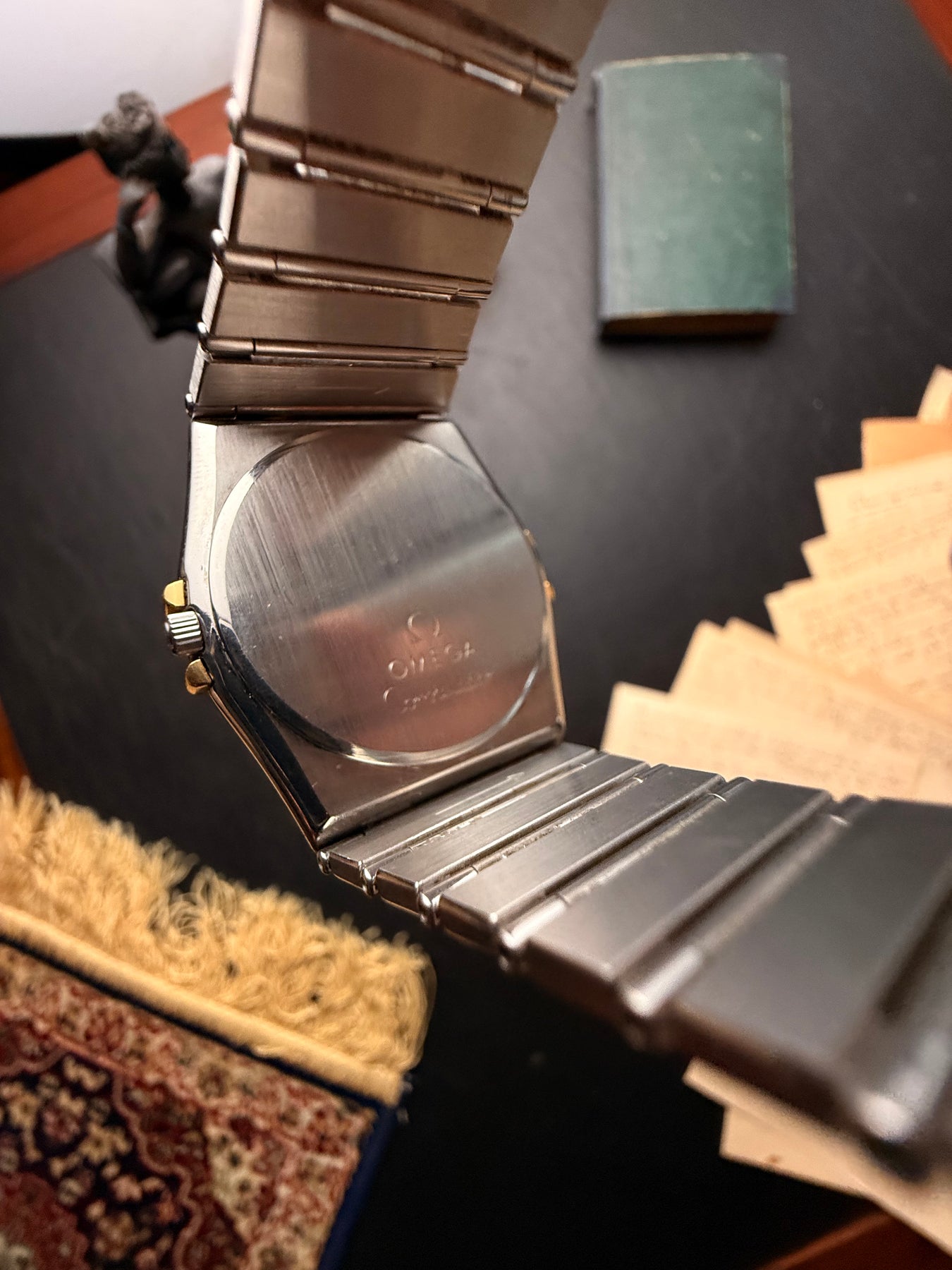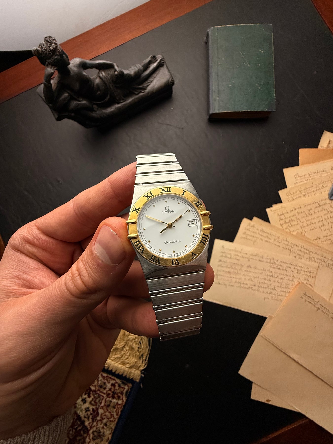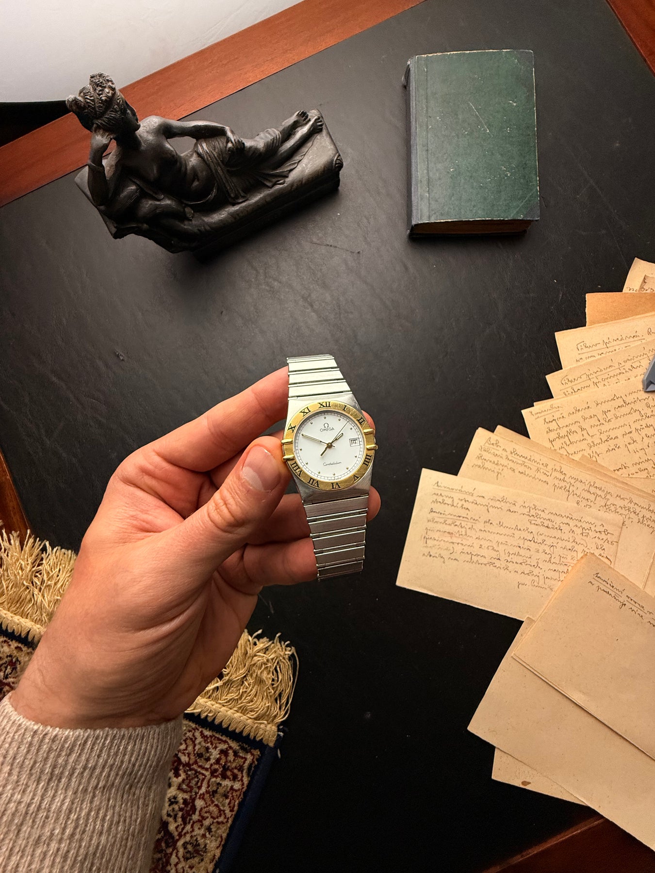 The defining characteristic of this Omega Constellation is its seamless silhouette. Representing the celebrated "Manhattan" design language, the watch features a barrel-shaped case that flows continuously into the bracelet, creating a unified optical line on the wrist.
