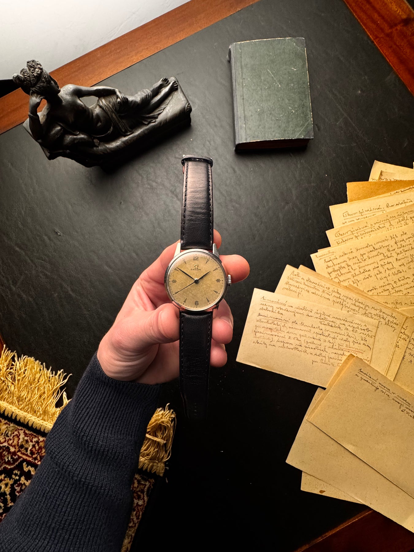 Driven by a robust Omega manual-winding movement, this watch is built on the legendary 30T2 architecture known for its military-grade reliability. The timepiece is secured with a classic black leather strap, which provides a sharp, formal contrast to the warm, textured face of the watch.