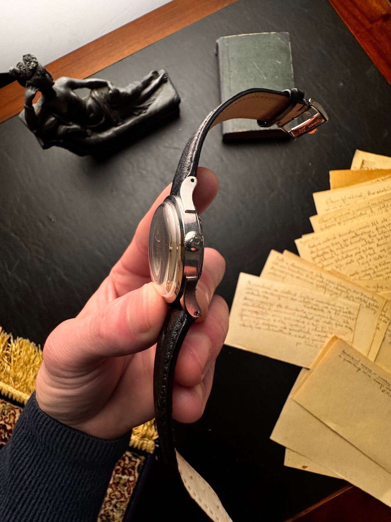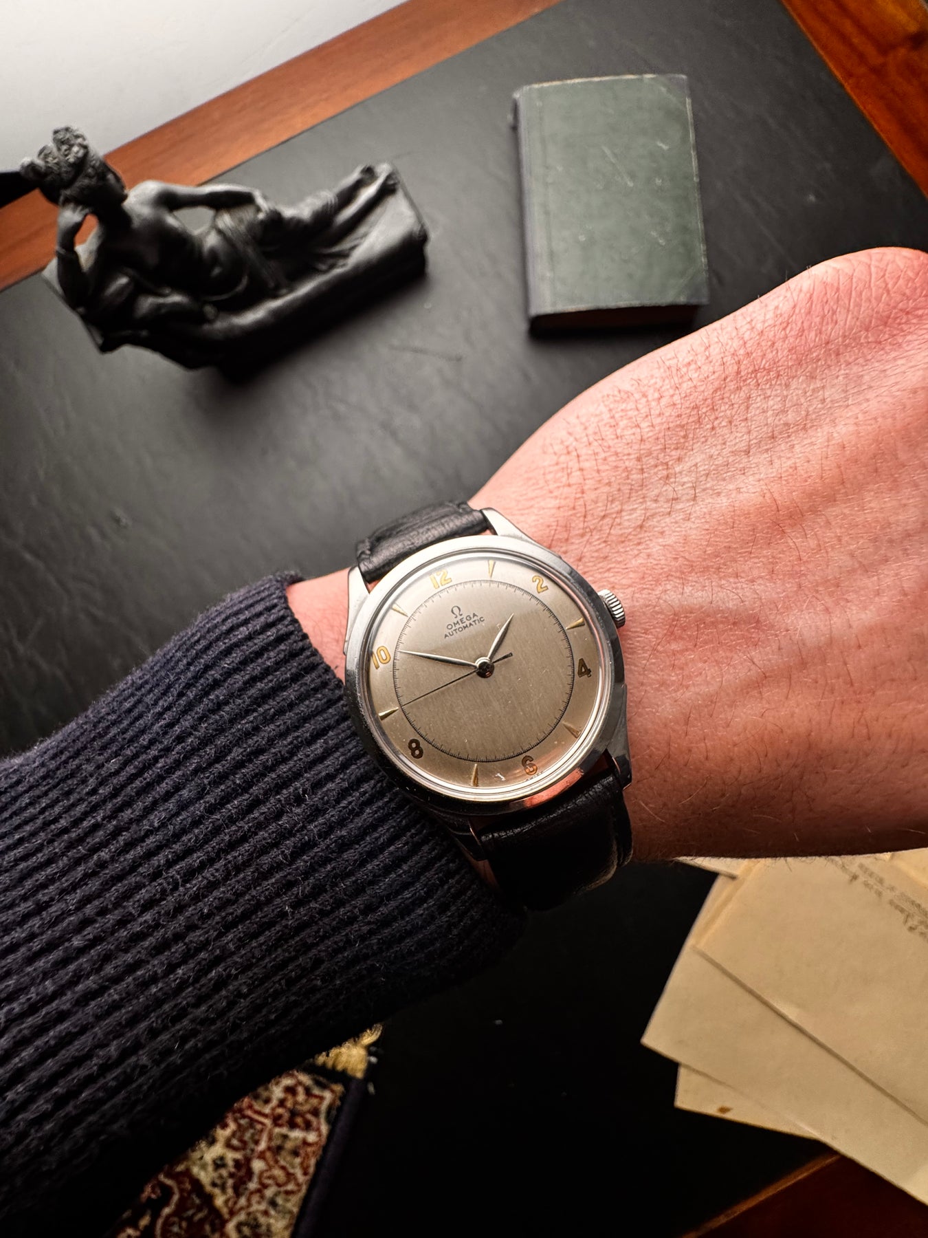 Powered by one of Omega’s legendary bumper or early rotor automatic movements, this watch is a reliable daily companion. It is paired with a classic black leather strap, making it the ultimate "gentleman’s steel" watch for formal occasions.