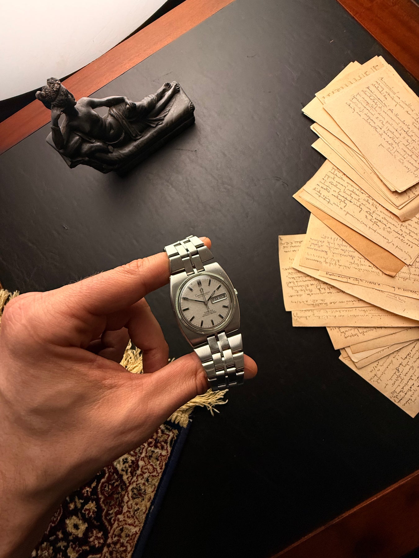The Omega Constellation is a masterpiece of late 1960s design, representing a bold departure from traditional round cases. This specific "C-shape" model is widely attributed to the legendary designer Gérald Genta, showcasing an architectural approach to watchmaking that remains stylish today.