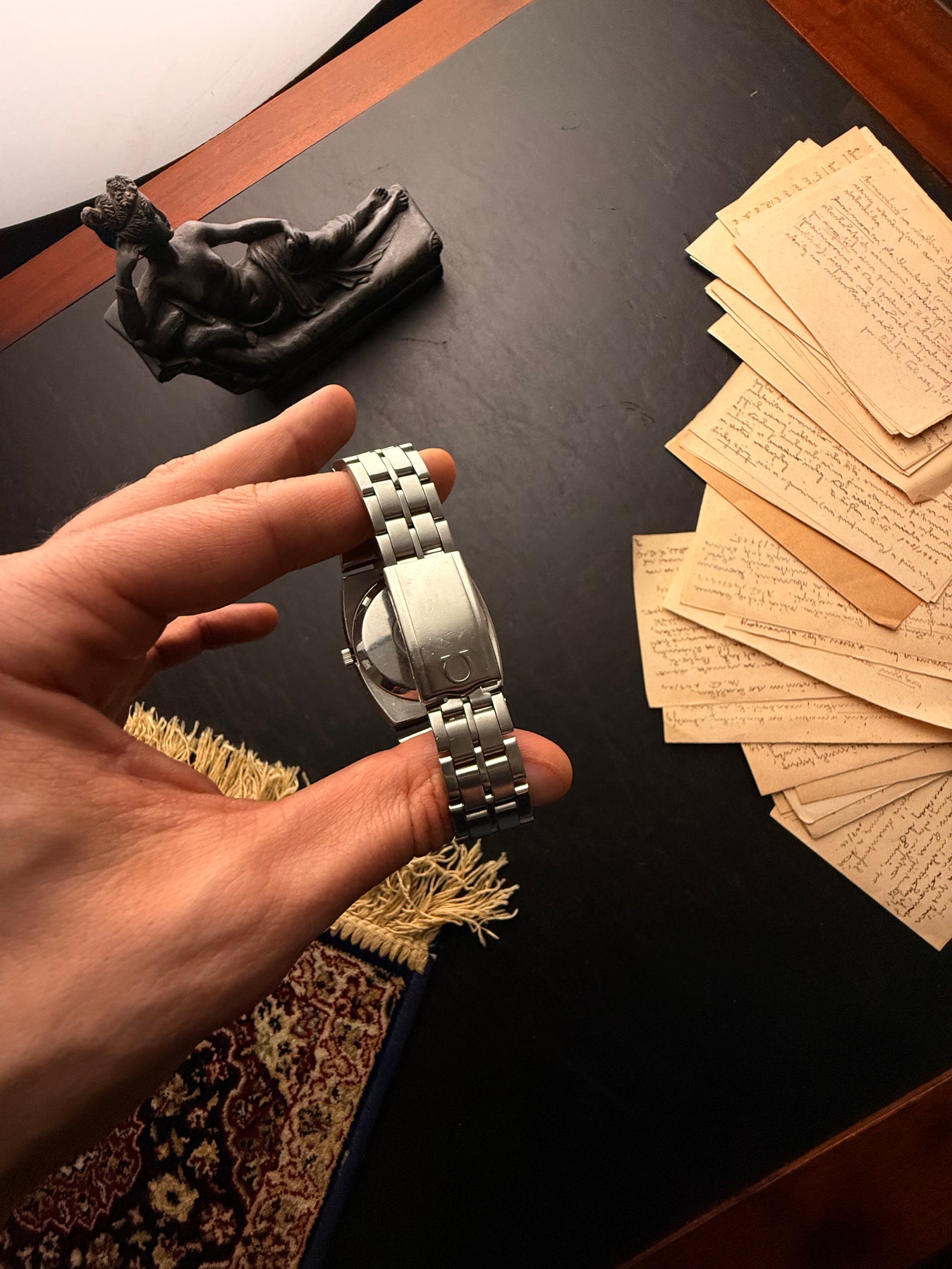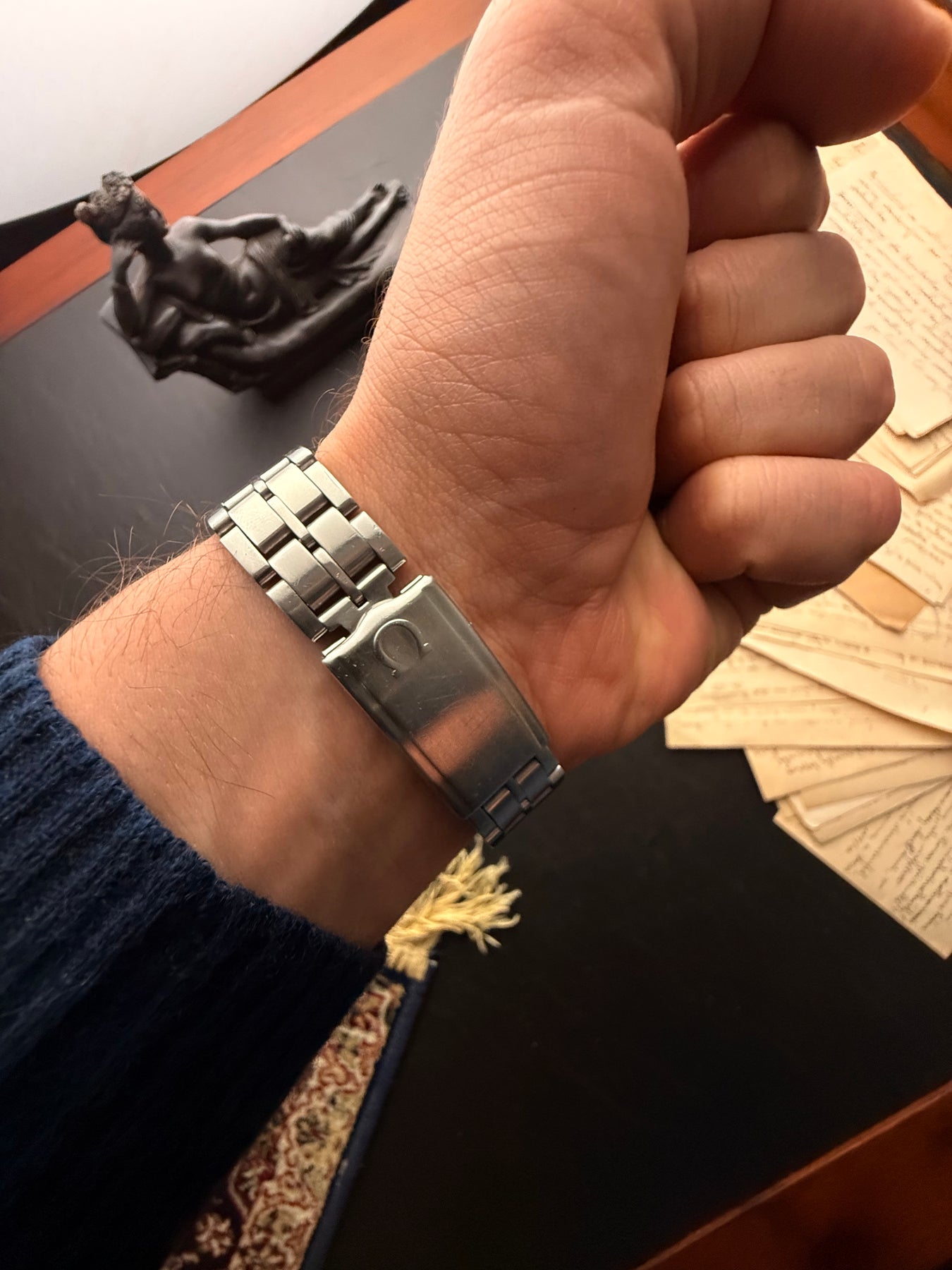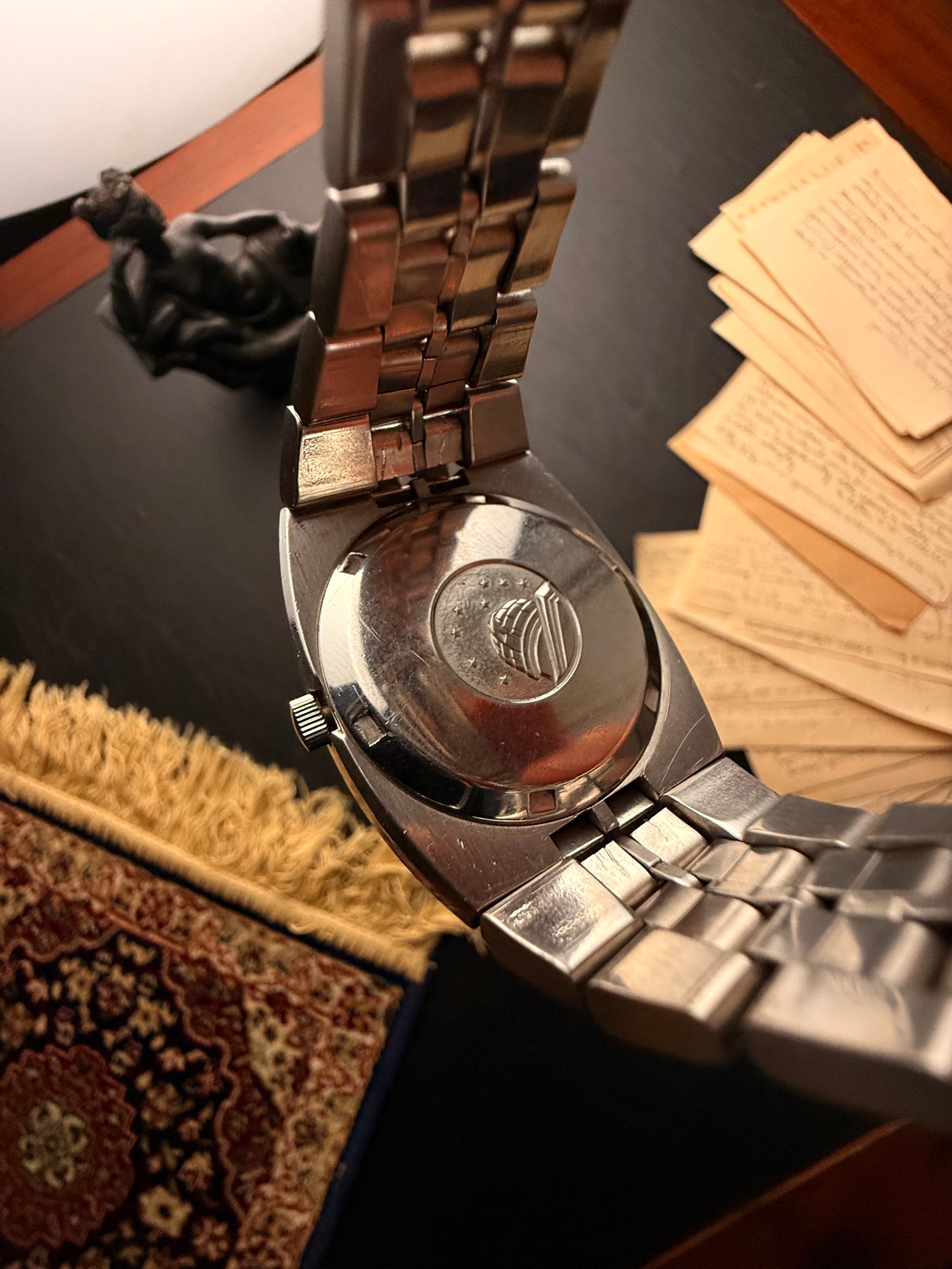 The watch is fitted with an original stainless steel brick-link bracelet. Known for its incredible flexibility and comfort, this bracelet hugs the wrist perfectly, completing the integrated look that defines this era of horology.